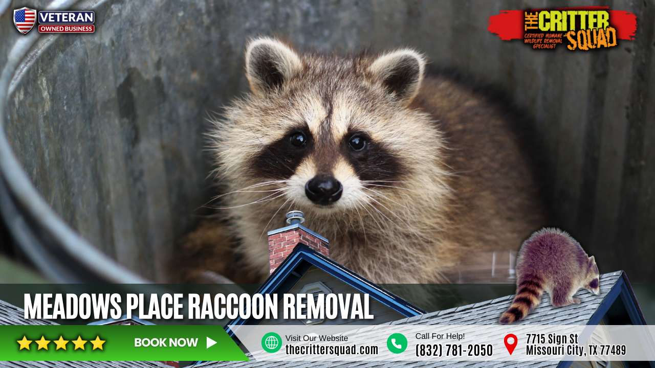 It doesn’t take much of an opening for a raccoon to gain access to your Meadows Place Texas home or business. Once you have a raccoons in the attic, the raccoon is likely to contaminate insulation, chew through building materials and gnaw on electric wires. Raccoons can be a health hazard. It’s important to call as soon as you realize that a raccoon living in your attic. Only insured raccoon removal professionals with a wildlife removal permit are qualified to deal with raccoon problems. Our team has the knowledge and experience to provide professional Meadows Place, Texas raccoon removal and raccoon exclusion services. We can help you get rid of that raccoons in the attic. Raccoons are associated with raccoon roundworm and rabies.