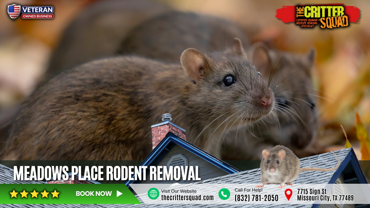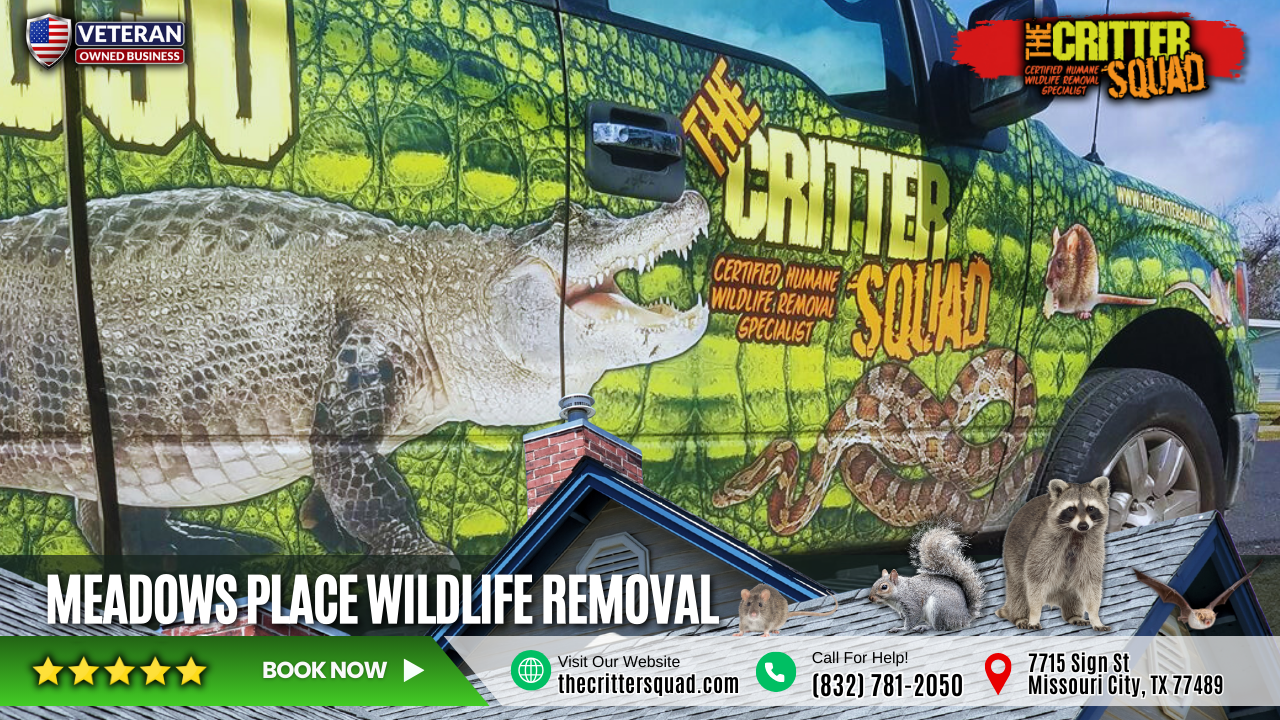 Serving Meadows Place TX and the surrounding Fort Bend County areas of Jersey Village, Aldine, Friendswood, League City, Texas City, Pearland, Missouri City, Meadows Place, Mission Bend, Bellaire, Hedwig Village, Katy, Richmond, and Rosenberg, and more. Contact us today if you are in need of professional Meadows Place TX animal removal services!