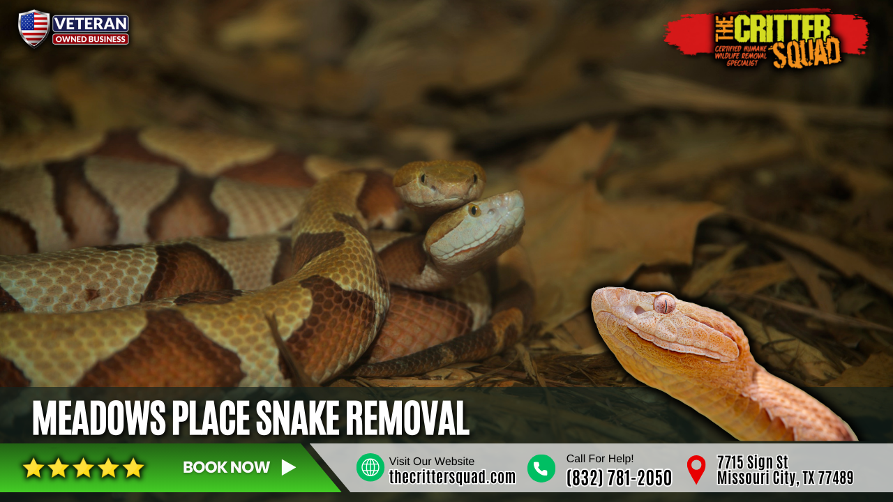 When a snake enters, they are often simply utilizing the same entrance/exit point that a rodent has used and are following the scent trails left by that rodent in search of food. There are poisonous species of snake in our area, they can be very aggressive when encountered. If a snake enters your home or business, give us a call immediately for professional Meadows Place snake removal! Not only can we humanely remove the snake, we can snake proof your home and install snake exclusion devices over the main entry points just in case there are more snakes inside the home. What happens quite often is that it becomes necessary to begin a pest control program at the same time to eradicate the food sources the snake has been in pursuit of.