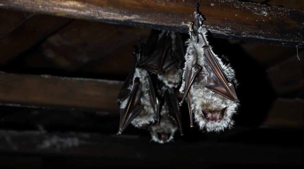 Hoary bats are another species commonly found in Texas. They are known for their large size and distinctive fur, which is dark with white tips. This gives them a frosted appearance. Hoary bats are solitary and prefer to roost in trees, but they may also find shelter in attics. Their diet mainly consists of moths and other insects, making them beneficial for pest control. Hoary bat conservation is important as their populations face threats from habitat loss and wind turbines. Protecting their habitats and raising awareness about their role in the ecosystem can help guarantee their survival. Understanding hoary bat characteristics can aid in recognizing their presence and promoting efforts for their conservation in Texas.
